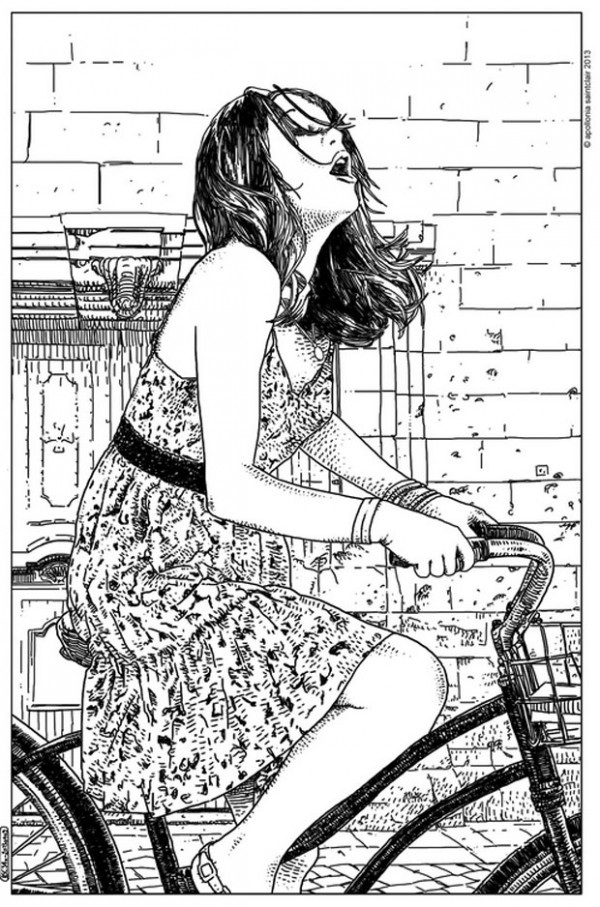Apollonia diz que gosta de contar histórias – e é capaz de fazer isso com uma única imagem. São ilustrações sugestivas. Muitas vezes, nem os rostos das garotas revelam. E nos fazem imaginar como elas se parecem. O que as levou até ali. Como aquela história acabou. A própria artista responde no Facebook que não fornece nenhuma informação pessoal, e dá uma única pista: “Vamos dizer que moro no velho mundo”. Resta a mim imaginar de onde ela é. Meu palpite: acho que mora na França.