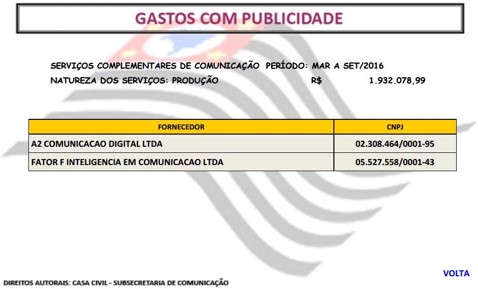 A Fator F é destaque nas planilhas de publicidade do governo Geraldo Alckmin como beneficiária de contratos nos anos de 2010, 2011, 2012, 2013, 2014 e 2016.