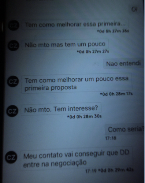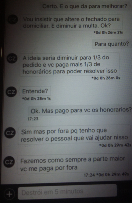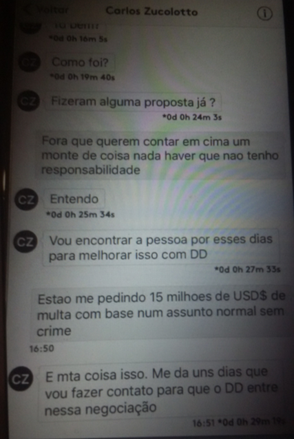 Observação: Pode ser mentira de Tacla Durán, mas ignorá-lo não vai esclarecer o caso. Durán apresenta como prova imagem das conversas com Zucolotto através do aplicativo Wickr – que apaga as mensagens depois de seis dias. Durán fez print screen da tela do celular. As imagens das conversas foram analisadas por um perito da Espanha e, segundo Durán, o laudo concluiu que não houve adulteração.