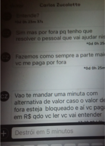 Observação: Pode ser mentira de Tacla Durán, mas ignorá-lo não vai esclarecer o caso. Durán apresenta como prova imagem das conversas com Zucolotto através do aplicativo Wickr – que apaga as mensagens depois de seis dias. Durán fez print screen da tela do celular. As imagens das conversas foram analisadas por um perito da Espanha e, segundo Durán, o laudo concluiu que não houve adulteração.