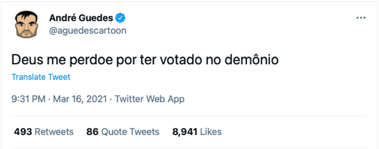 “Deus me perdoe por ter votado no demônio”, escreveu no Twitter.