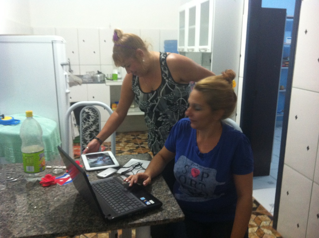 Fui tomar um cafezinho na casa das Maribeis agora à tarde. As duas sofriam com a conexão de Internet – eu mesma já desisti. Tenho usado somente o telefone e as mensagens de texto. A internet é lentíssima, quase insuportável. Mas as duas eram persistentes. É o principal meio de comunicação. Elas disseram que 2 minutos de ligação para Cuba por telefone custam 10 reais, então ligam muito pouco.