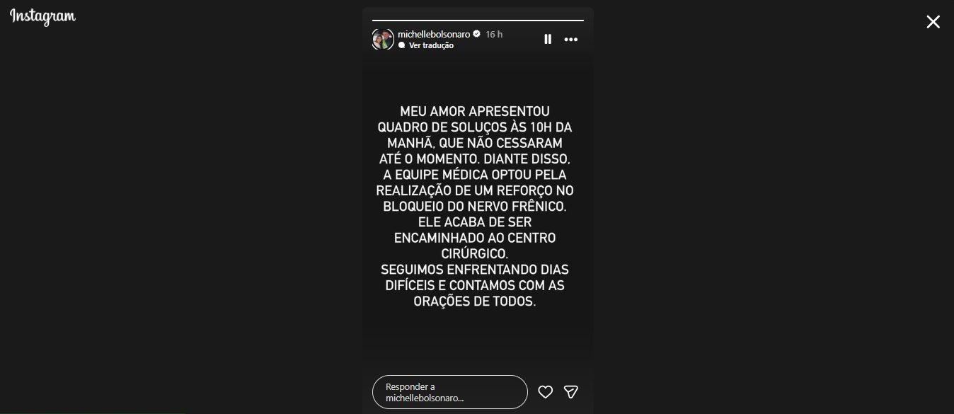 “Meu amor apresentou quadro de soluços às 10h da manhã, que não cessaram até o momento” escreveu Michelle em seu Instagram. “Diante disso, a equipe médica optou pela realização de um reforço no bloqueio do nervo frênico. Ele acaba de ser encaminhado ao centro cirúrgico. Seguimos enfrentando dias difíceis e contamos com as orações de todos”