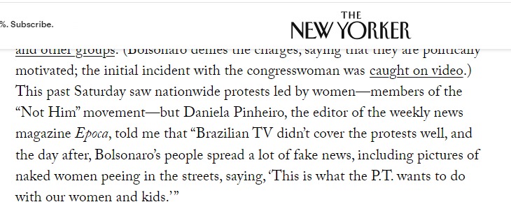 Ela disse: “A TV brasileira não cobriu bem os protestos, e no dia seguinte o pessoal do Bolsonaro espalhou um monte de fake news, incluindo mulheres nuas mijando nas ruas e dizendo: ‘É isso que o PT quer fazer com nossas mulheres e filhos.'”