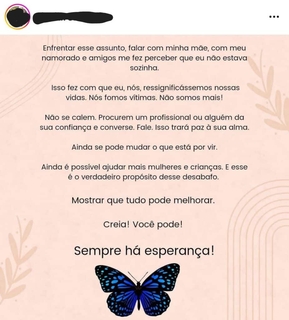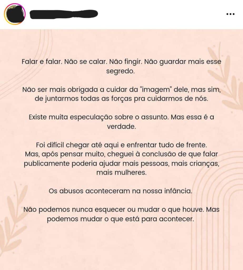 Com Zé Renato indiciado na tarde desta quarta-feira (6), Cíntia foi às redes lançar um desabafo (leia as postagens abaixo). É um relato de dor, desespero e pensamentos suicidas desencadeados a partir de um trivial banho. Mas também é um manifesto poderoso para que tais abusos não sejam silenciados pelo descaso, que surge até na forma de conselhos aparentemente bem-intencionados: “Deixe isso para lá” ou “Pra que mexer mais?”.