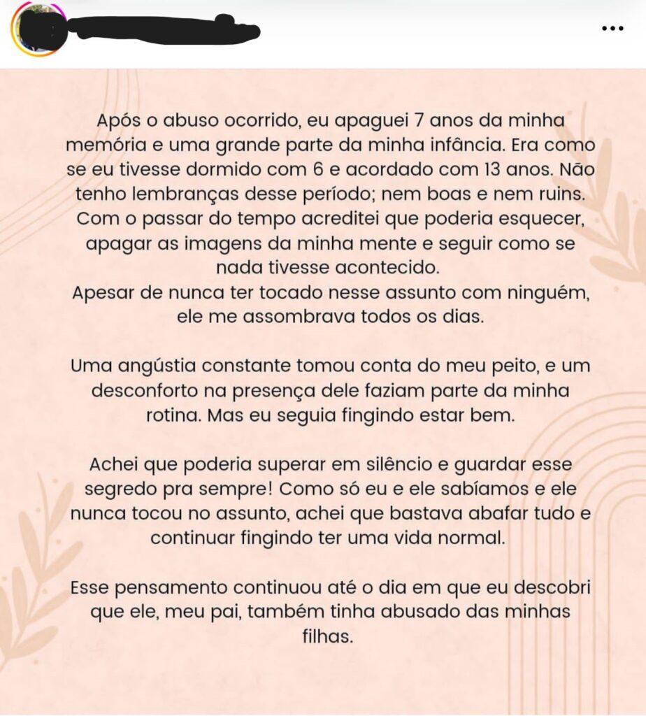 O que agora está exposto é uma história de traumas e silêncios depressivos ao longo de 42 anos para a mãe e 9 anos para as filhas. As três começaram a ser abusadas por volta dos 6 anos. O caso seguia em segredo de Justiça e era acompanhado por MONEY REPORT desde abril.