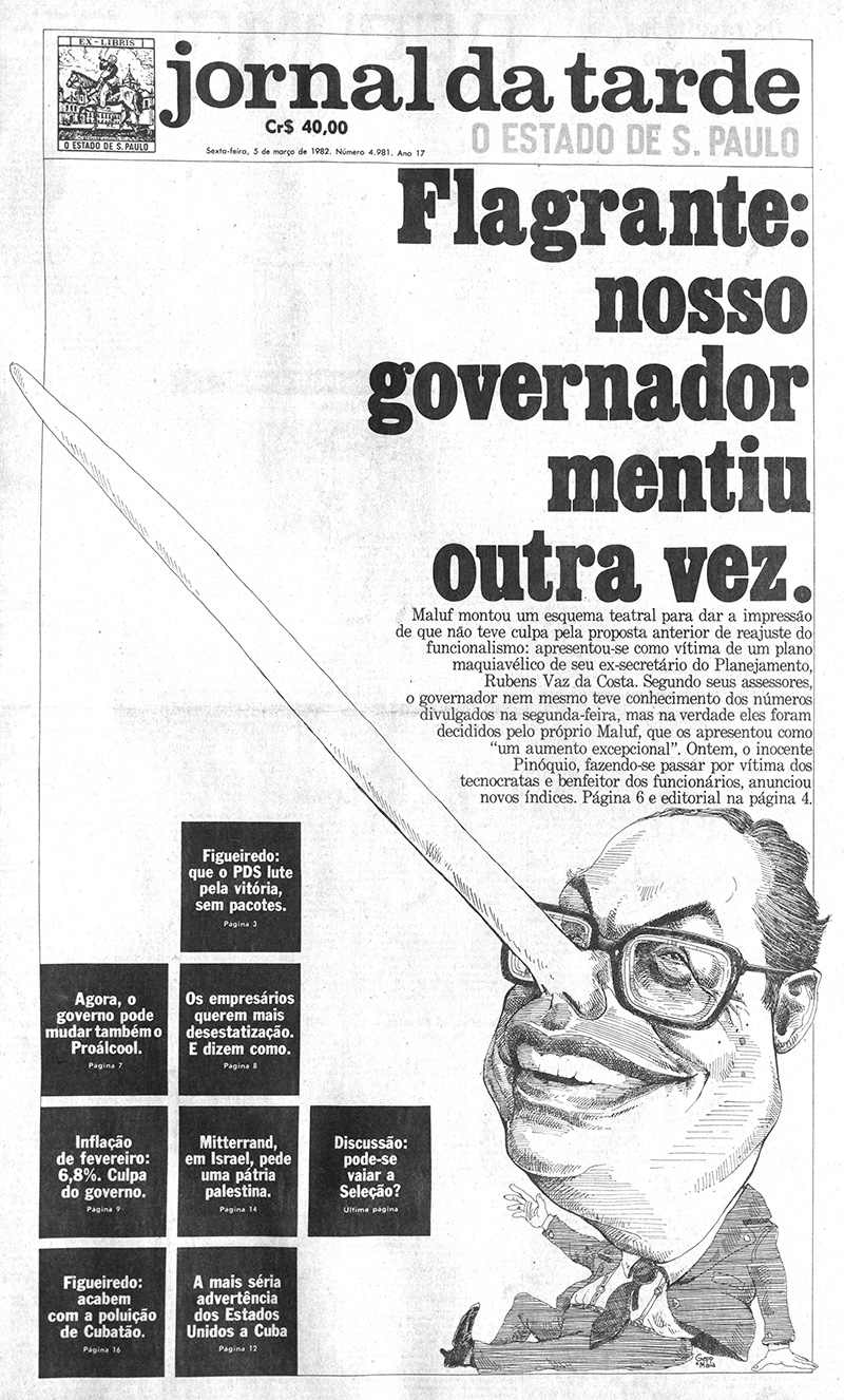 A dupla de cartunista Gepp e Maia desenhou Maluf com um nariz de Pinóquio que crescia a cada edição. Brilhante. Pouca gente achou que seria difícil surgir na vida nacional alguém capaz de tanta cascata quanto Maluf.