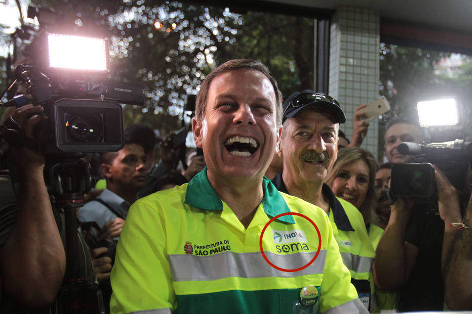 A Soma e a Inova estão na lapela do uniforme de gari de João Doria, em tamanho grande.