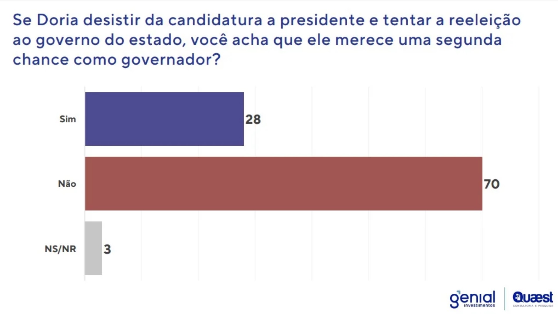 Com seu desempenho pífio nas pesquisas para presidente, o tucano pode tentar a reeleição para o Palácio dos Bandeirantes. A grande maioria dos paulistas, no entanto, acha que ele não merece uma segunda chance como governador. 70% são contra a continuação de Doria no governo de São Paulo e 28% lhe dariam mais uma oportunidade.
