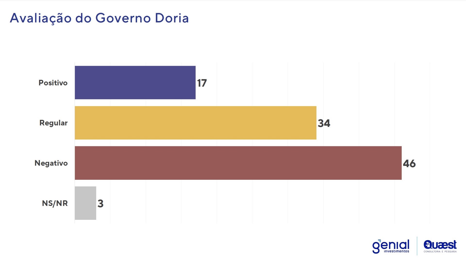 46% dos entrevistados reprovam a gestão do tucano, enquanto somente 17% a avaliam positivamente. 34% veem o governo Doria como regular. Em relação à expectativa dos eleitores, 48% dizem que sua administração é pior do que se esperava. Apenas 12% acreditam ser melhor que o esperado.