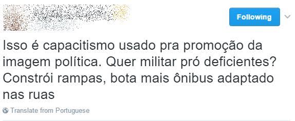 “Doria é o prefeito da cidade mais rica, mas tudo o que importa pra ele é a imagem. Isso é capacitismo [deficiência das pessoas] usado pra promoção da imagem política. Quer militar pró-deficientes? Constrói rampas, bota mais ônibus adaptado nas ruas. Mas o que esperar do prefeito que quer deixar a cidade mais linda apagando a arte dos nossos muros e pintando tudo de cinza, não é mesmo?”, escreveu Ana, estudante e cadeirante, no Twitter.