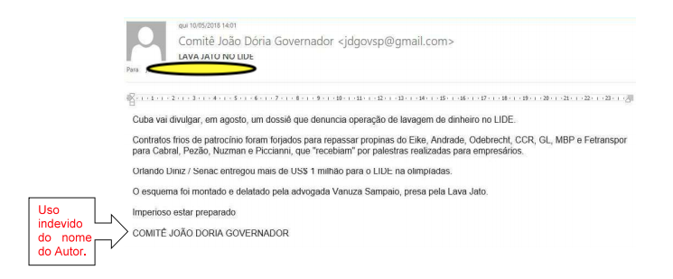 Trata-se da conta de e-mail jdgovsp@gmail.com, que, de acordo com os advogados de Doria, estaria sendo utilizado por seu proprietário para se fazer passar por fonte de informações oficial do candidato, o que não seria verdade.