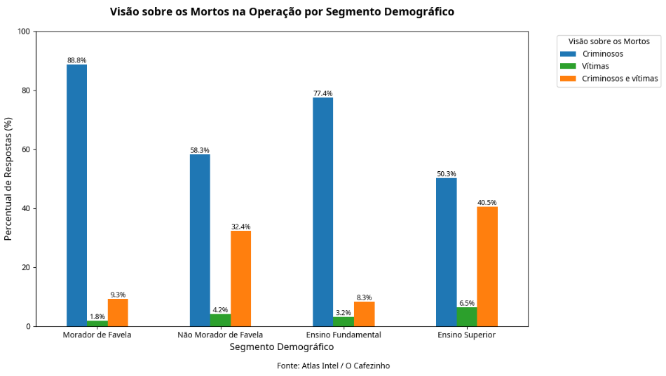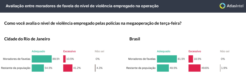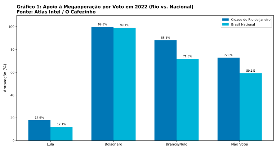 A pesquisa revela uma divisão marcante de visões de mundo. Entre os eleitores de Lula no Brasil, houve uma percepção muito crítica da operação, especialmente pelo número de mortos. Já entre os eleitores de Bolsonaro, ela foi aprovada quase por unanimidade: 99,1% de aprovação entre bolsonaristas, contra apenas 12,1% entre lulistas.