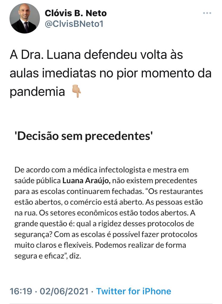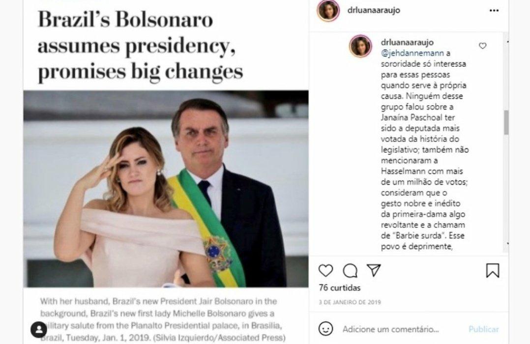 Abaixo, um post dela no Instagram defendendo a primeira-dama Michelle na posse. No Estadão, advogou a volta às aulas na pandemia.
