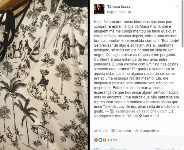 “Confere? É uma estampa de escravas entre palmeiras. É uma escrava com um filho nas costas servindo uma branca? Perguntei à vendedora se aquela estampa tinha alguma razão de ser ou se era só uma estampa racista mesmo”, diz um trecho da publicação, que até agora tem mais de 14 mil curtidas e 1.700 compartilhamentos.