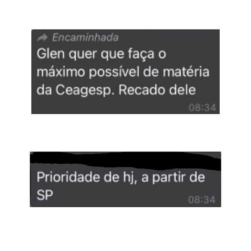 “O Glen quer que faça o máximo possível de matéria da Ceagesp. Recado dele”, diz a primeira mensagem. “Prioridade de hoje, a partir de São Paulo”, complementa a direção. Em oito meses de 2021, a EBC já produziu 23 matérias sobre o Centro de Entrepostos.