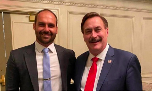 Michael Lindell relatou que se encontrou com “o filho do Bolsonaro na noite passada”. Falou isso em 6 de janeiro, o que significa que teria cruzado com Eduardo na “residência privada” de Trump.