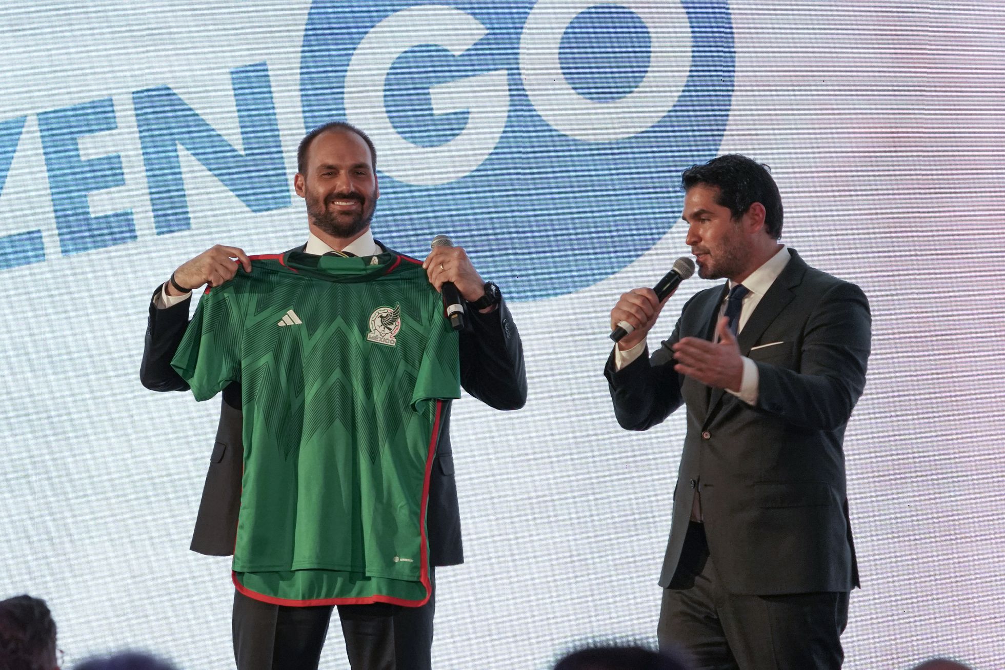 Eduardo Bolsonaro ganha camisa da seleção mexicana no CPAC no México