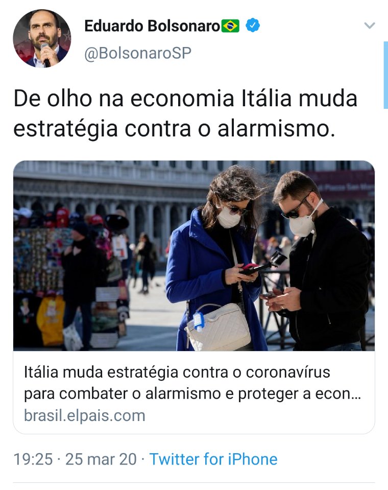Eduardo Bolsonaro postou no Twitter uma matéria do El Pais dando conta de que a Itália está “mudando a estratégia” do combate ao coronavírus “contra o alarmismo”.