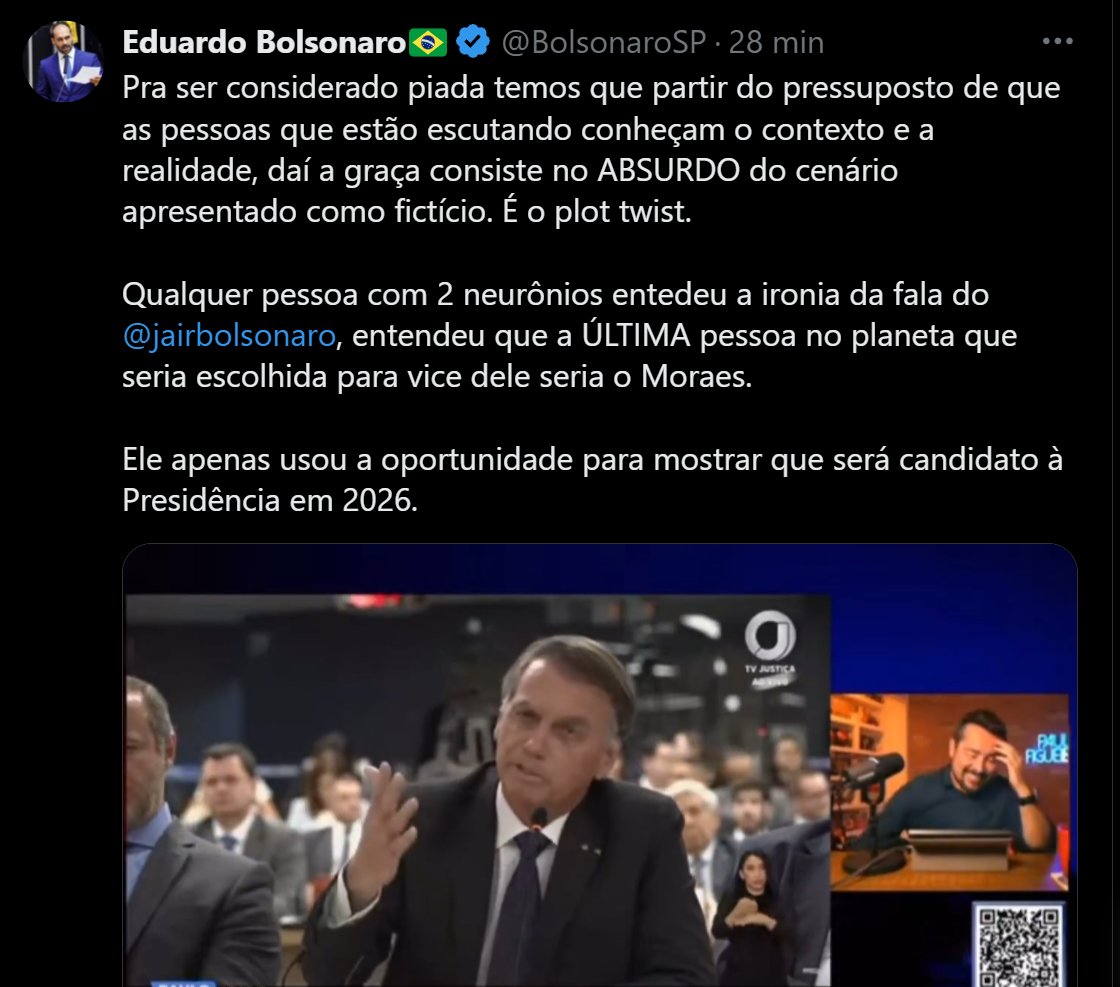 “Qualquer pessoa com 2 neurônios entendeu a ironia da fala do presidente Bolsonaro, entendeu que a ÚLTIMA pessoa no planeta que seria escolhida para vice dele seria o Moraes. Ele apenas usou a oportunidade para mostrar que será candidato à presidência em 2026.”