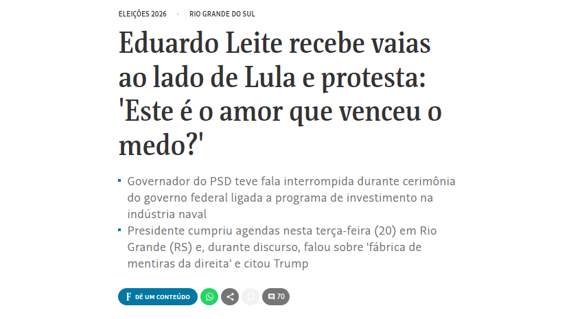 Será pior do que em 2022. Mas a Folha preferiu destacar que Leite foi vaiado, num evento de Lula, cercado por petistas e numa cidade governada por petista, a prefeita Darlene Pereira.