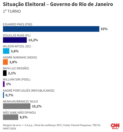 O prefeito do Rio de Janeiro até um mês atrás, Eduardo Paes (PSD), aparece na liderança de uma nova pesquisa para o governo fluminense divulgada nesta sexta-feira (24). O levantamento do Instituto Paraná Pesquisas mostra que ele tem 53% das intenções de voto, percentual que seria suficiente para liquidar a eleição já no primeiro turno.