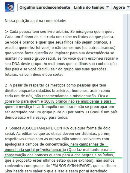 A página “Orgulho de Ser Branco” se esconde sob a justificativa de divulgar características e qualidades da “raça branca”. Mas basta um olhar atento nos posts e comentários para constatar a ideologia racista disfarçada de revisionismo histórico e com doses pesadas de pseudociência. Navegar pela página é como voltar aos tempos em que as ideias do médico Nina Rodrigues sobre a inferioridade dos não brancos eram levadas a sério.