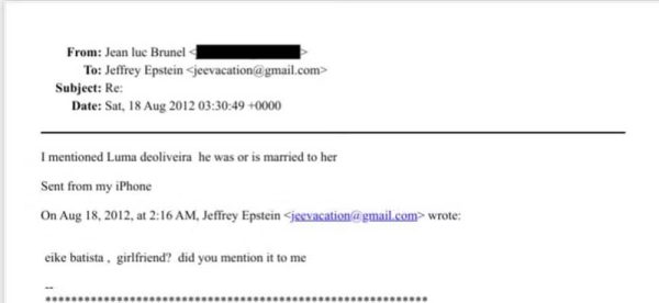 Entre os documentos divulgados, há uma mensagem em que Epstein pede informações a Brunel sobre a então companheira de Eike Batista. “E a namorada do Eike Batista? Você chegou a comentar isso comigo”, questiona o empresário americano.