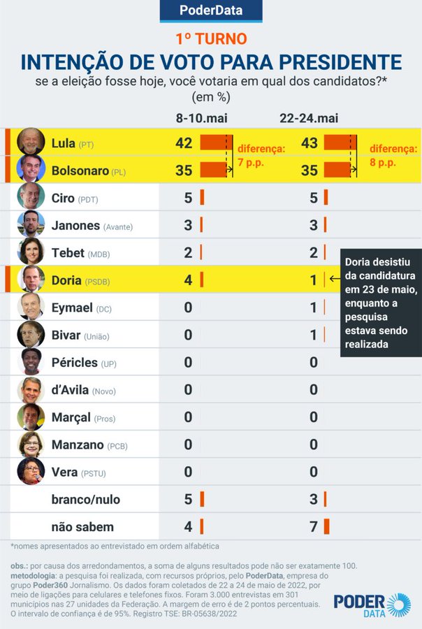 O petista registra 43% das intenções de voto para o 1º turno das eleições de 2022. Em 2º lugar, o ex-capitão do Exército possui 35%. A diferença entre os dois aumentou 1% em comparação com a rodada de 15 dias antes.