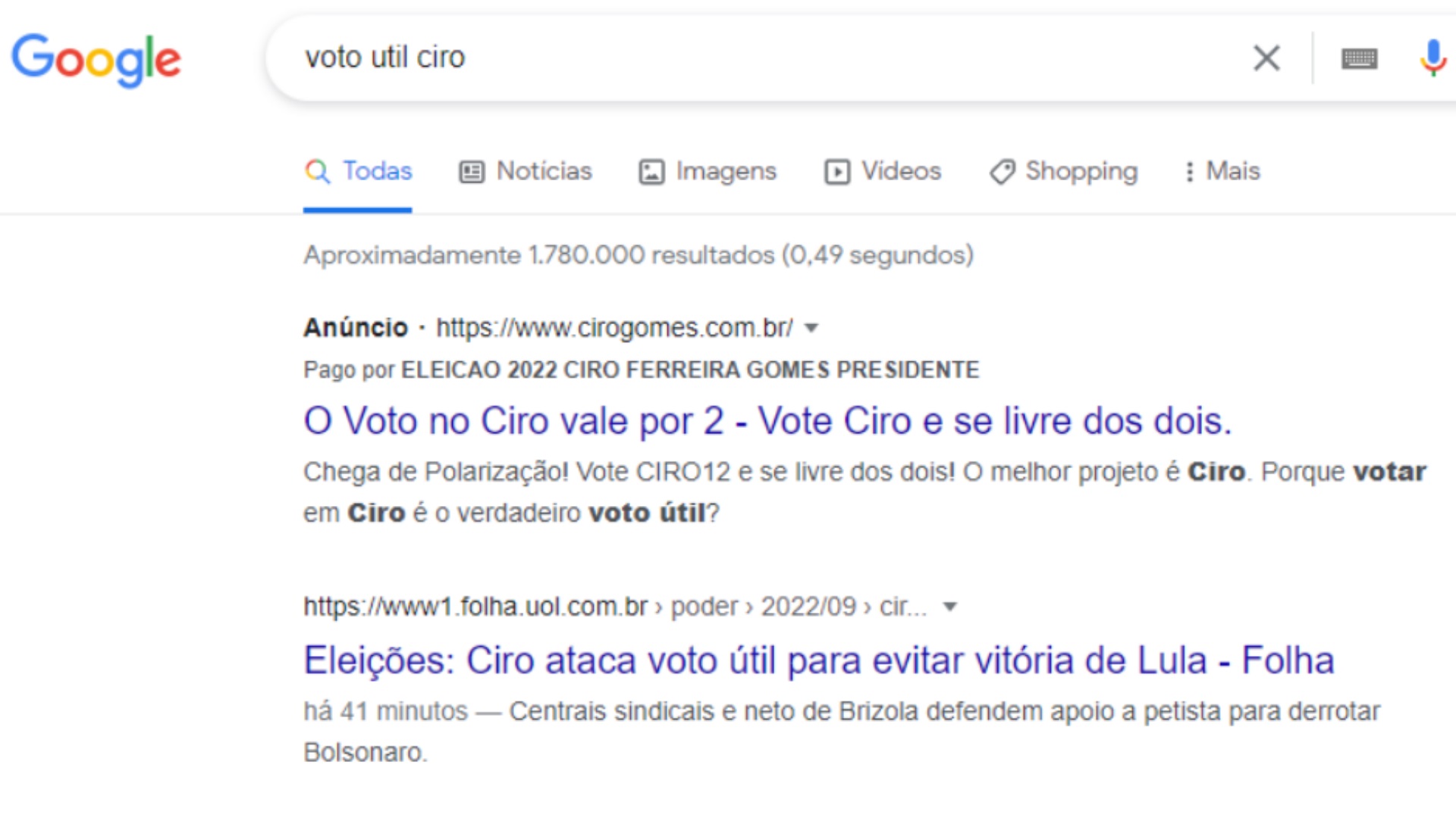 O pedetista está se empenhando tanto para mudar o cenário nessas eleições que sua campanha está pagando anúncios no Google sobre o “voto útil”, em uma tentativa de mudar a escolha do eleitorado pelos principais candidatos ao Palácio do Planalto. Ao buscar “voto útil Ciro” no Google, o site do pedetista aparece no topo, com a mensagem “Pago por Ciro Ferreira Gomes”.