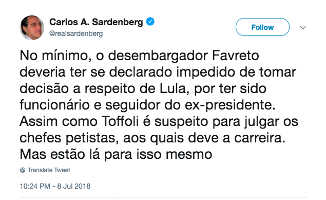 “No mínimo, o desembargador Favreto deveria ter se declarado impedido de tomar decisão a respeito de Lula, por ter sido funcionário e seguidor do ex-presidente”, escreveu.