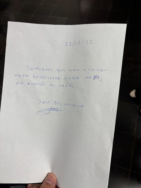“Informo que não concederei entrevista nesta data, por questões de saúde”, diz o bilhete. Este seria o primeiro momento em que ele falaria com a imprensa desde que foi imposta a ele uma série de medidas cautelares, em julho, após a condenação no caso da trama golpista. A última entrevista de Bolsonaro foi em 15 de julho.