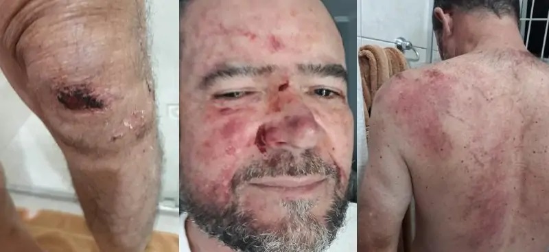 No dia 25 de abril, o professor Sergio Ubiratã foi à Central de Flagrantes de Curitiba. Aos 61 anos, com 1,75m e 70kg, ele tinha lesões espalhadas pelo corpo e sangue esguichado na lataria do carro. Exames feitos dois dias depois, no Hospital XV, atestaram múltiplas contusões e ferimentos, mordedura humana, uma costela fraturada e traumatismo craniano leve. Apesar disso, o Boletim de Ocorrência (B.O.) registrado naquele dia descreve sua condição física como “íntegra”. O autor da agressão é um vizinho dez anos mais jovem, significativamente mais alto e forte: o policial civil Gilnei Hartleben Diel, que no B.O. aparece como “vítima”.