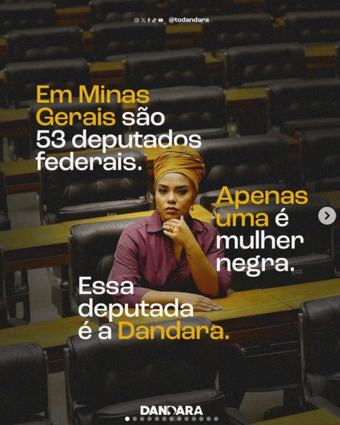 Um exemplo: a deputada federal Dandara Tonantzin tem, como primeira publicação fixada em sua página no Instagram, um carrossel que destaca, na primeira imagem, o fato de que ela é a única mulher negra da bancada mineira.