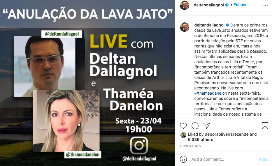 Por incrível que pareça, o homem branquelo com cara infantil, de bochechas rosadas, “discípulo de Jesus, pai apaixonado, Mestre por Harvard, procurador por vocação, [cheio] de opiniões pessoais”, como consta em seu Twitter, procurador da operação Lava-Jato, que se mancomunou com o ex-juiz agora declarado ladrão pelo STF, ou suspeito no jargão jurídico (a operação “Spoofing” assim o prova), Sergio Fernando Moro, fez uma live com Thaméa Danelon, coordenadora da Lava-Jato em SP.