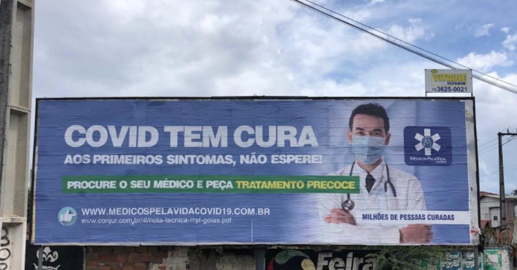 Neste domingo (18), circula nas redes sociais a imagem de um outdoor no qual médicos prometem a cura da Covid-19 com “tratamento precoce” à base de cloroquina.