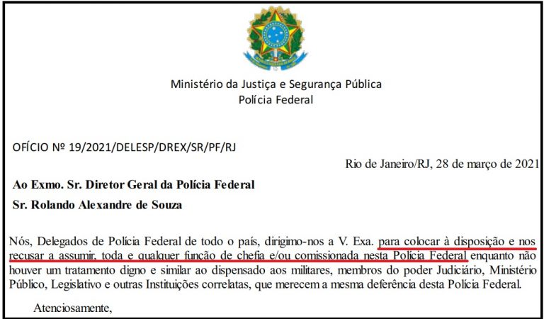 Em um documento que começa a receber assinaturas nesta quinta-feira (18/03) e que deverá ser entregue ao diretor-geral do Departamento de Polícia Federal (DPF), Rolando Alexandre de Souza, no dia 28 de março, quando a instituição completará 77 anos, os delegados federais de todo o Brasil colocam à disposição os seus cargos de chefia e anunciam a disposição de “recusar a assumir toda e qualquer função de chefia e/ou comissionada”.