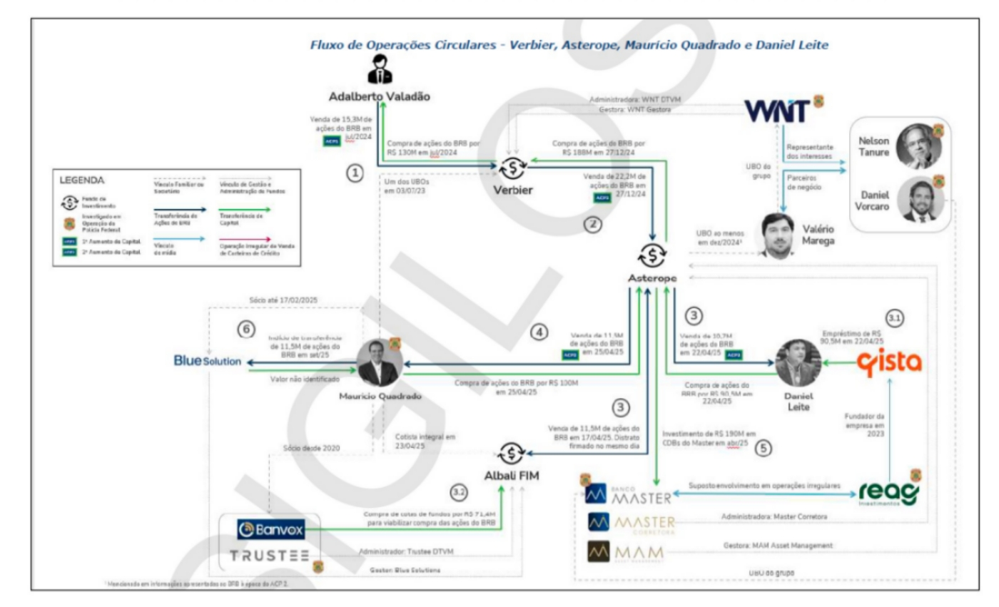 Já Adalberto Valadão Júnior teria servido, segundo a petição, para viabilizar a entrada do fundo Verbier, da Victoria FIM, no quadro societário do BRB por meio de contrato de compra e venda de recibos de subscrição no valor de R$ 130 milhões, também em julho de 2024.