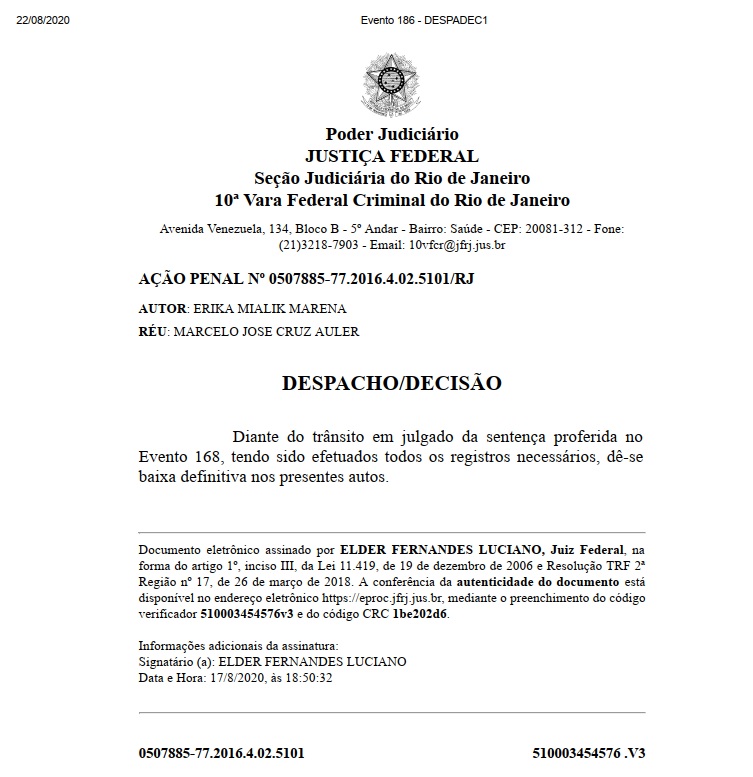 A sentença do juiz Elder Fernandes Luciano, da 10ª Vara Criminal Federal do Rio de Janeiro, foi na mesma toada. Segundo ele, “não restam dúvidas de que o jornalista MARCELO JOSÉ CRUZ AULER exerceu o seu direito de reportar aquilo que entendia conveniente, não incidindo em qualquer tipo penal.”