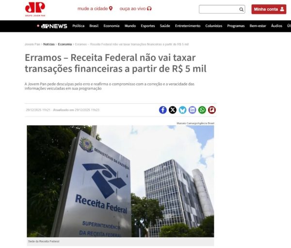 A mentira foi compartilhada no dia 2 de dezembro e, nesta segunda (29), a Jovem Pan admitiu o erro, apontando que “a suposta taxação não existe e nem seria viável de acordo com a lei”. O programa exibido no início do mês foi retirado do ar.