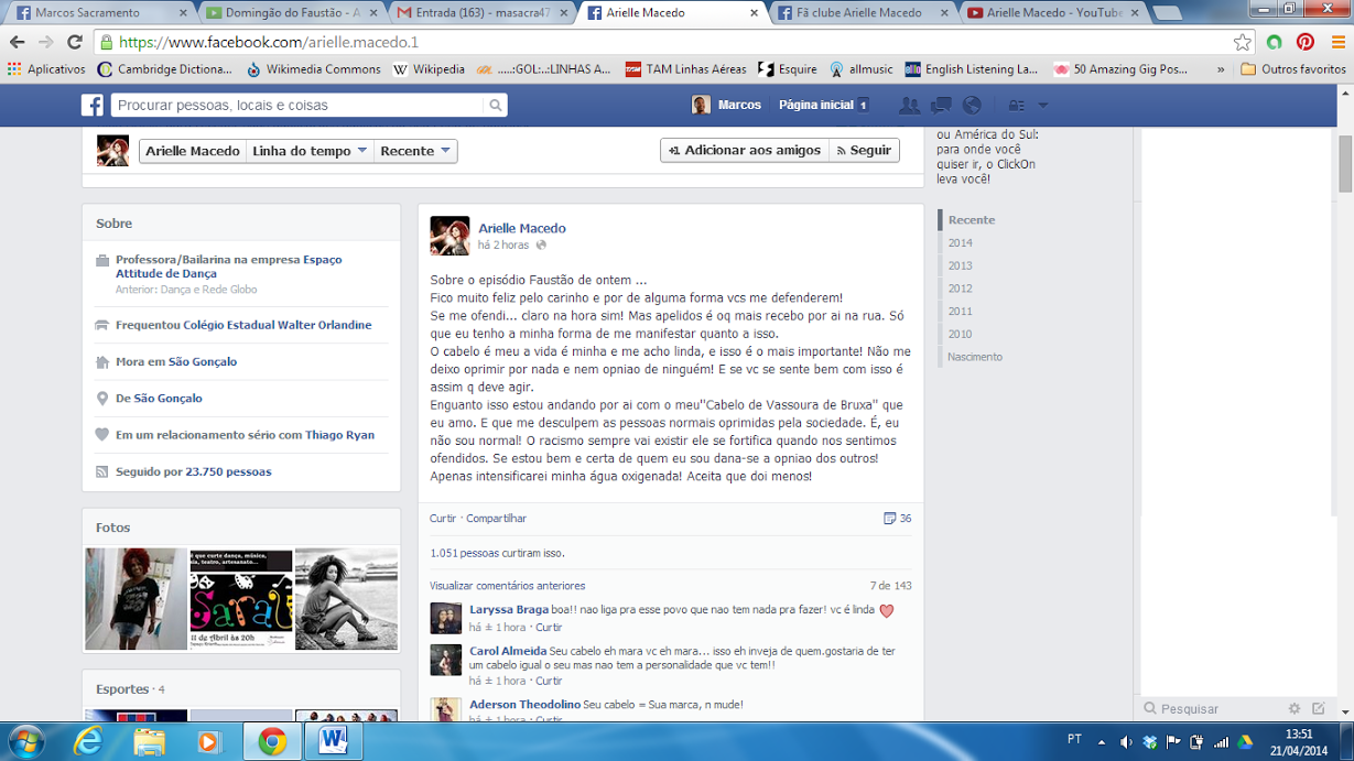 O desabafo de Arielle no Facebook, retirado do ar horas depois