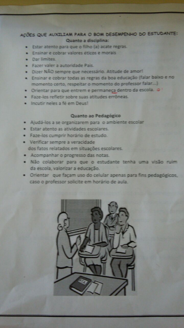 A Escola Estadual Pirassununga distribuiu durante reunião de pais na data de hoje, um folheto com “orientações” voltadas tanto aos pais quanto a professores. Na seção dirigida aos pais, uma das recomendações é que deve-se incutir a fé em Deus nas crianças. Faz parte das “ações que auxiliam o bom desempenho do estudante”.