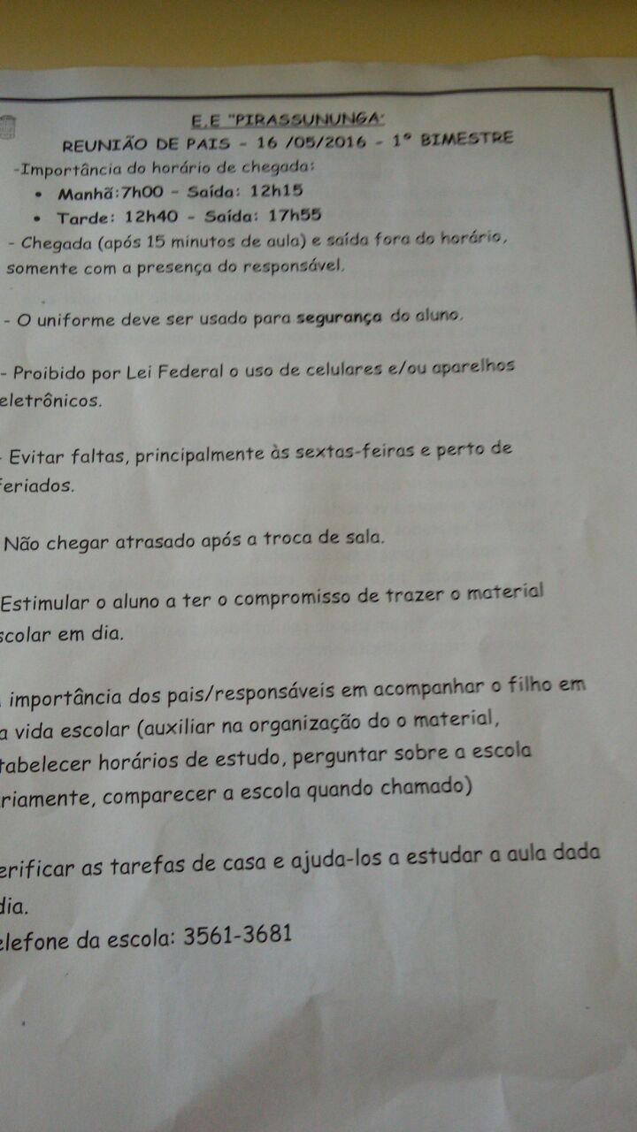 A Escola Estadual Pirassununga distribuiu durante reunião de pais na data de hoje, um folheto com “orientações” voltadas tanto aos pais quanto a professores. Na seção dirigida aos pais, uma das recomendações é que deve-se incutir a fé em Deus nas crianças. Faz parte das “ações que auxiliam o bom desempenho do estudante”.
