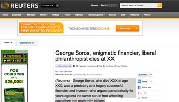 A Reuters publicou acidentalmente um obituário do influente empresário e filantropo George Soros na quinta-feira à tarde. O obituário, que foi escrito pelo repórter Todd Eastham, parecia ter sido preparado com antecedência e incluiu texto fictício no lugar para a sua idade e data da morte.