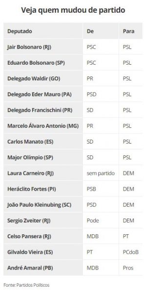 Ao todo, foram consultados 22 dos 25 partidos na Câmara. Dos 15 deputados que trocaram de legenda, 8 migaram para o PSL; 4, para o DEM; 1, para o PT; 1, para o PCdoB; e 1 para o Pros.