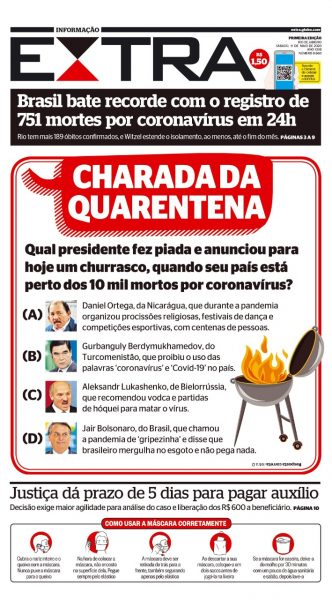A capa do jornal Extra, do Rio de Janeiro, apresentou uma ‘charada da quarentena’, ironizando o último polêmico anúncio feito pro Jair Bolsonaro.