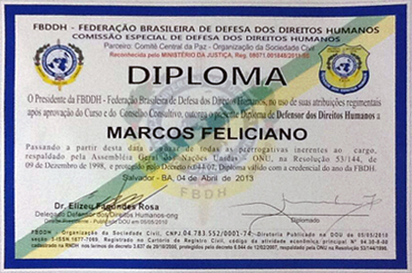 Uma entidade do interior baiano aproveitou a passagem do deputado Marco Feliciano (PSC-SP) por Salvador, na noite de quinta-feira (4), para lhe entregar um “diploma de defensor dos direitos humanos”.