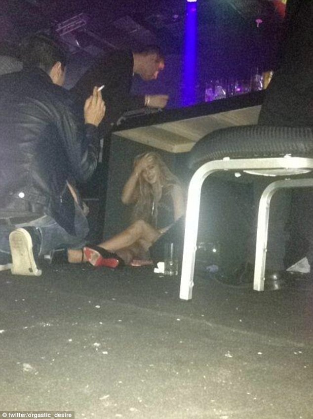 Em uma foto que apareceu no Twitter, a atriz pode ser vista sentada num chão sujo, coberto com o que parece ser bebidas alcoólicas. Por quê? De acordo com a pessoa que fez a foto, Lohan – que parece chateada e tem a mão na testa – não queria tirar fotos com os fãs presentes.