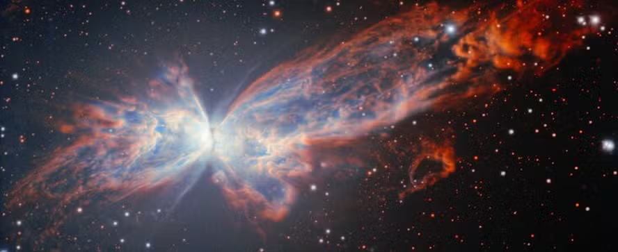 O telescópio Gemini Sul, no Chile, celebra seu 25º aniversário com uma imagem impressionante da Nebulosa Borboleta (NGC 6302). A fotografia revela detalhes das vastas nuvens de gás e poeira estelar dessa estrutura cósmica, localizada na constelação de Escorpião, a uma distância entre 2.500 e 3.800 anos-luz da Terra.