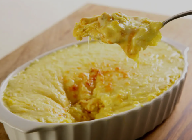 Para fazer, basta refogar peito de frango desfiado com alho, cebola e temperos a gosto. O creme leva milho batido com leite e uma colher de manteiga, que dá o ponto ideal de textura. Depois, é só juntar tudo e finalizar com queijo ralado no forno.